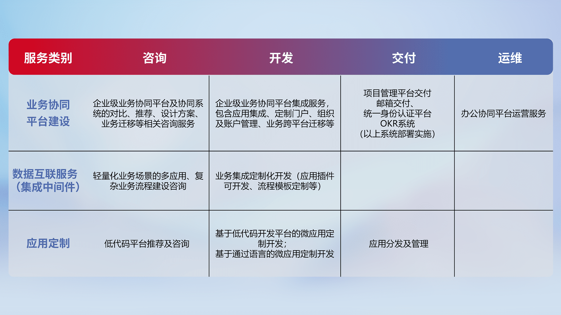 针对钉钉、、、、企微、、、IDaas等平台级产品提供产品的规划、、方案、、、交付、、、、定制化开发等服务,,,,实现如统一协同办公、、、、智能客户服务、、混合会议管理、、智能数据查询、、、等业务场景,,,,实现数字化转型。。