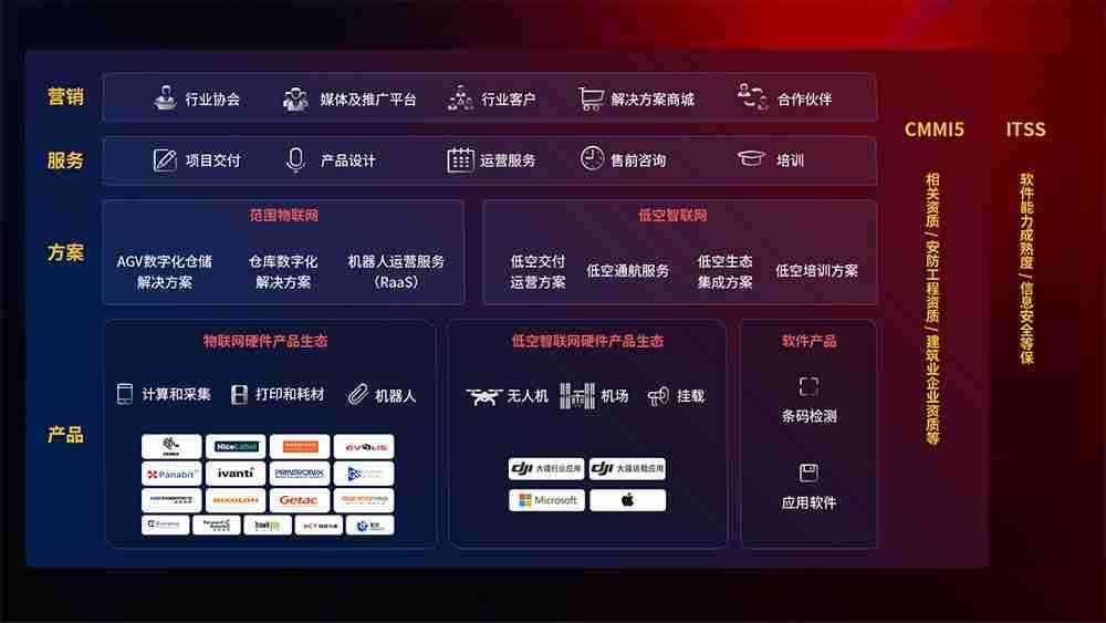 聚合国内外先进的物联网硬件产品品牌,,,聚焦数字化仓储、、机器人运营、、、、低空智联网等领域,,,,共同打造适合客户业务场景的解决方案并提供交付服务