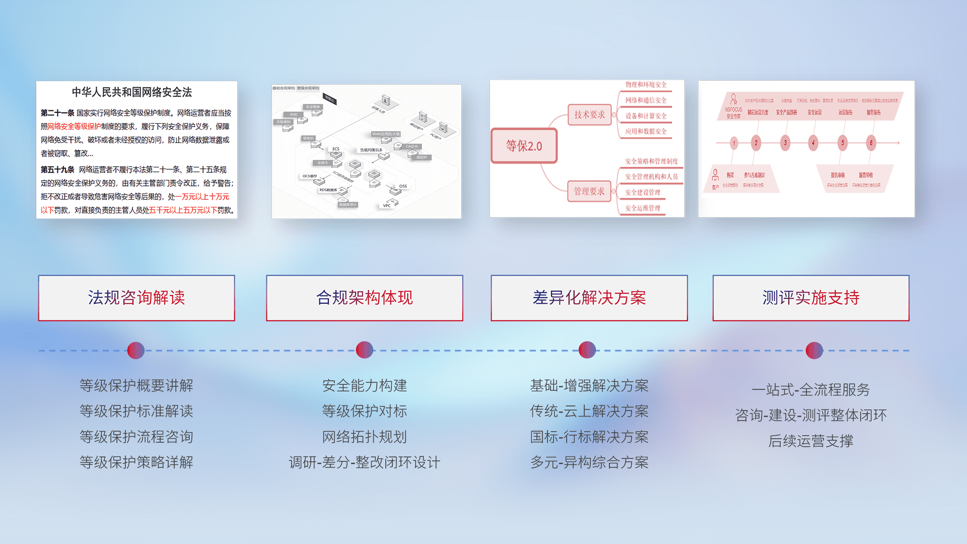通过专业的法律咨询解读、、合规架构体现、、差异化解决方案、、、、测试实施支持等服务,,,,为客户量身打造等保合规体系。。